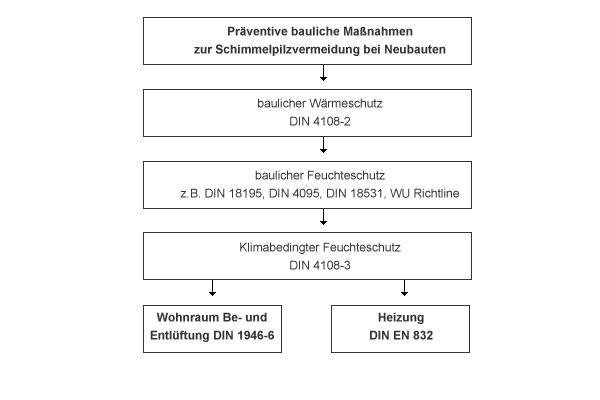 Ausreichende Feuchtigkeit ist die Grundvoraussetzung für Schimmelpilzschäden im Innenbereich.Abhängig vom Dämmstandart sollten bei Überschreitung der Raumluftfeuchtigkeit von 50% (Altbau) bis 60% (Neubau) Maßnahmen zur Absenkung ergriffen werden.Z. B. keine Wäsche in der Wohnung trocknen, Pflanzenbestand begrenzen, anhaftendes Wasser an der Duschwand gleich trocknen, nach dem Duschen nach außen ablüften.Der Wert der relativen Luftfeuchte kann mit einem Hygrometer kontrolliert werden.