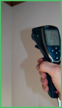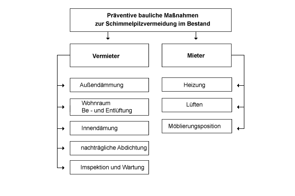 Ausreichende Feuchtigkeit ist die Grundvoraussetzung für Schimmelpilzschäden im Innenbereich.Abhängig vom Dämmstandart sollten bei Überschreitung der Raumluftfeuchtigkeit von 50% (Altbau) bis 60% (Neubau) Maßnahmen zur Absenkung ergriffen werden.Z. B. keine Wäsche in der Wohnung trocknen, Pflanzenbestand begrenzen, anhaftendes Wasser an der Duschwand gleich trocknen, nach dem Duschen nach außen ablüften.Der Wert der relativen Luftfeuchte kann mit einem Hygrometer kontrolliert werden.